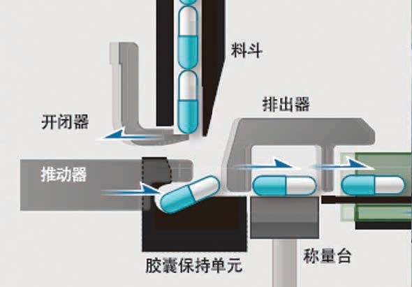 ![]() | 通過開閉器使料斗內(nèi)的膠囊逐一落下, 在保持單元停留并抑制下落時產(chǎn)生的晃動, 然后利用推送器送至稱量臺。 |