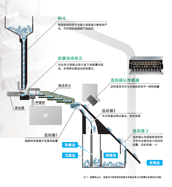 (2)實現(xiàn)空膠囊的穩(wěn)定傳送 針對填充前的空膠囊重量較輕容易跳動的特性,安立采用獨特的膠囊處理技術(shù)實現(xiàn)穩(wěn)定傳送。而且通過膠囊保持單元有效抑制空膠囊的晃動,從而實現(xiàn)了高精度的重量測量??漳z囊的全數(shù)重量檢查可提高新藥品的試驗以及臨床驗證的可靠性。 | |