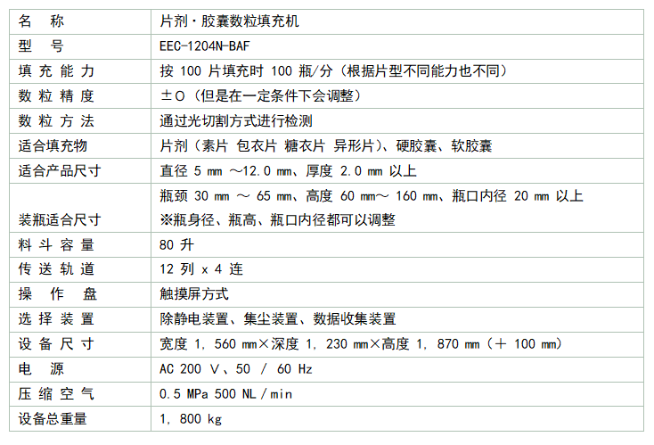 川越片劑·膠囊數(shù)粒填充機(jī)采用日本尖端技術(shù),搭載雙重檢測傳感器對(duì)各類片劑/膠囊產(chǎn)品進(jìn)行精確計(jì)數(shù),實(shí)現(xiàn)100%零誤差。同時(shí),通過時(shí)序閥門控制實(shí)現(xiàn)快速填充,品種登錄可以達(dá)到200種,成為全球行業(yè)首選。