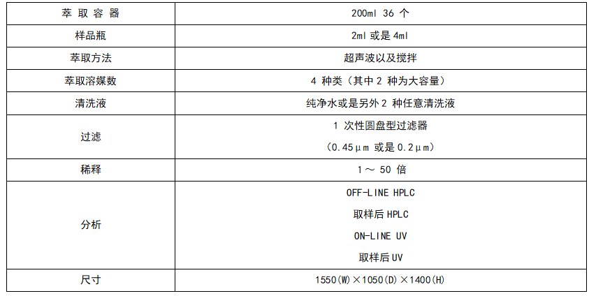 (1)對應含量均一性測試以及定量測試??梢詮姆爆嵉牟僮髦薪饷摮鰜?,儀器自行進行終夜無人操作 (2)萃取溶媒的添加、內(nèi)部標注溶液的添加、萃取、稀釋以及過濾為止的一連操作自動完成 (3)可以進行使用 UV 以及 HPLC 時的數(shù)據(jù)解析以及制作報告書 (4)萃取容器的清洗以及干燥為止自動完成 |